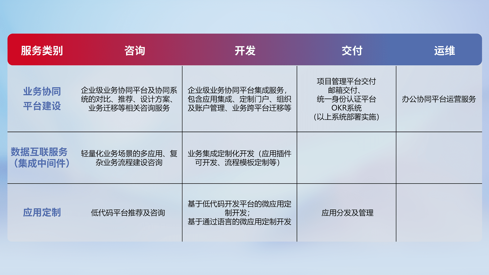 针对钉钉、、企微、、、IDaas等平台级产品提供产品的规划、、、方案、、、、交付、、、、定制化开发等服务,,实现如统一协同办公、、智能客户服务、、、混合会议管理、、智能数据查询、、等业务场景,,实现数字化转型。。。