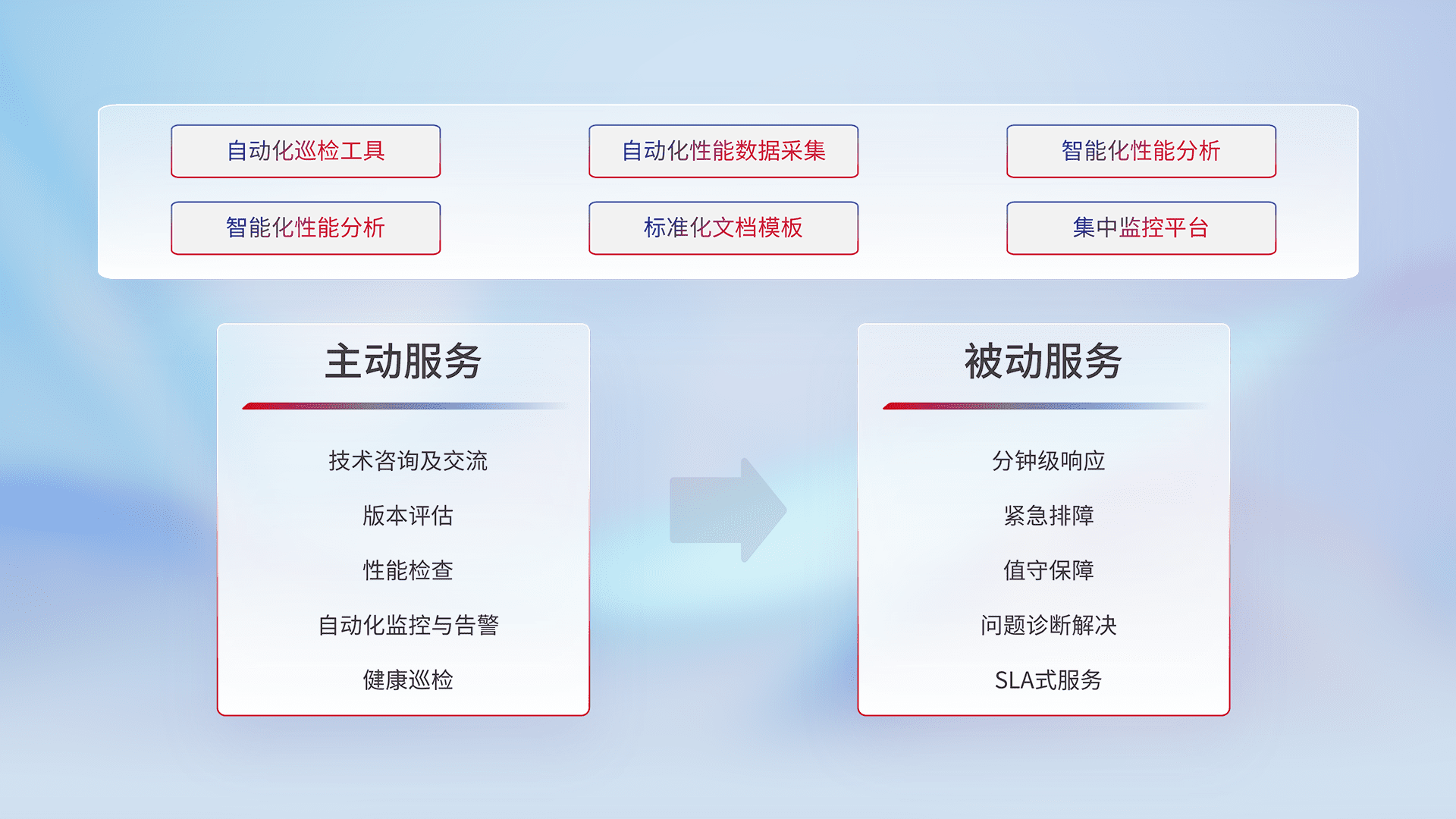 智能化工具和标准化文档,,,保障服务质量,,提供主动服务(包含技术咨询、、、、版本评估、、性能检查、、、自动化监控与告警、、健康巡检)和被动服务包含(分钟级响应、、、、紧急排障、、、、值守保障、、、问题诊断解决、、、、SLA服务)。。